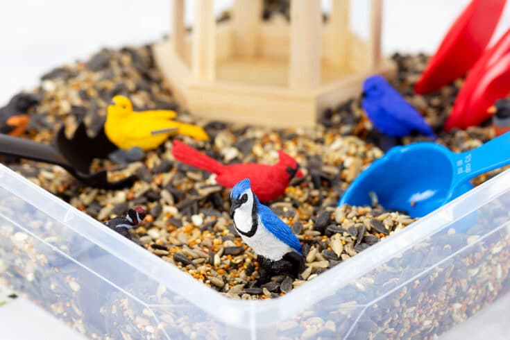 When my boys were little, I kept a large birdseed sensory bin in our garage. Buried deep in the seed was an assortment of plastic bird toys, miniature wooden birdhouses, a bird feeder, funnels, scoopers, measuring cups, and tongs that my kids used for sensory play.