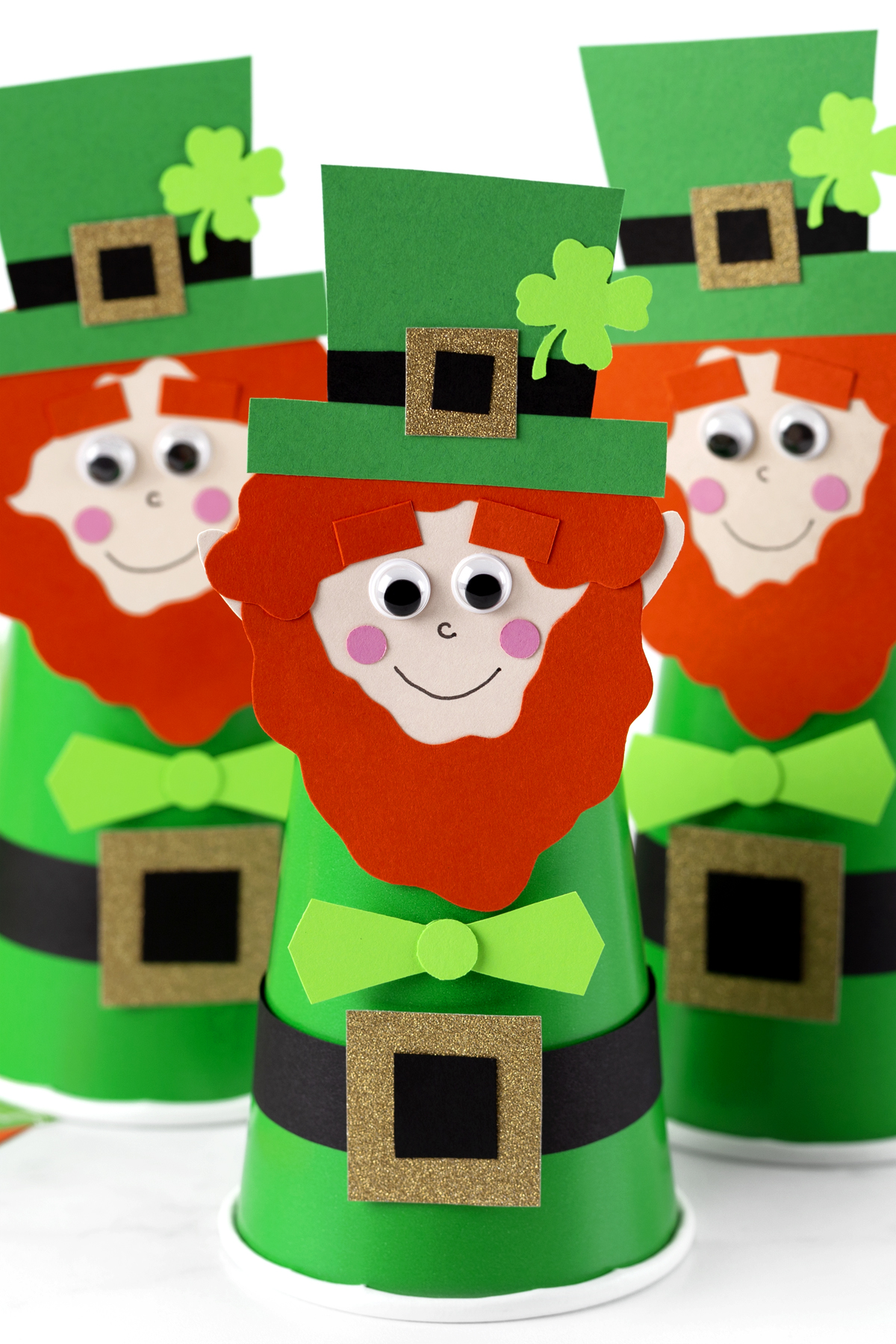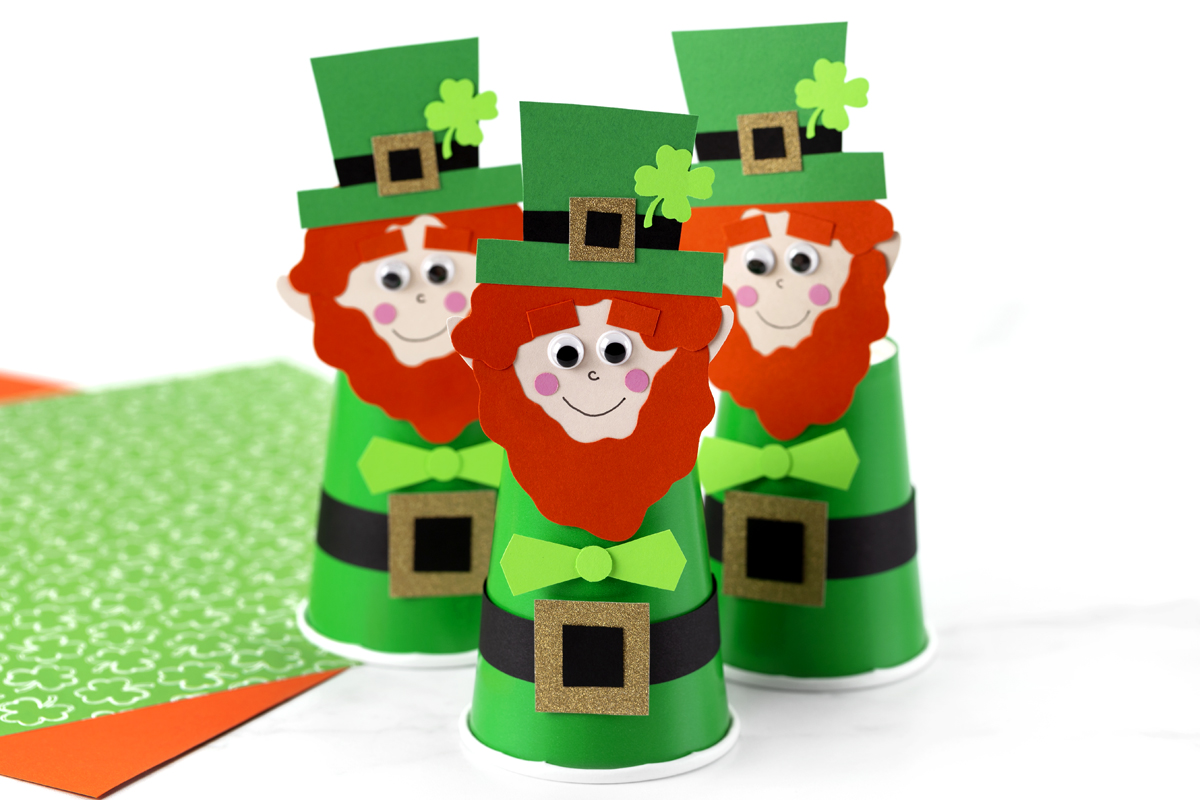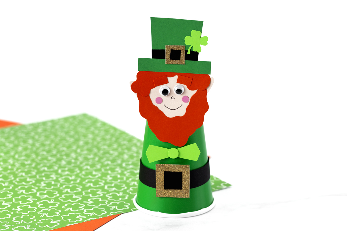 - Download and print the template. Print the Paper Cup Leprechaun template on white cardstock and cut out the shapes. Trace onto colored cardstock if desired, then cut out the pieces.