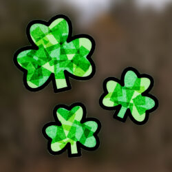 Follow the instructions below to create a colorful tissue paper shamrock suncatcher for St. Patrick’s Day.